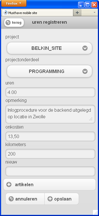 Uren detailschermIn het uren detailscherm kunnen uren geregistreerd worden en kan een opmerking bij deze uren worden ingevoerd. Net als in de reguliere WATCH applicatie kunnen ook hier eigen kenmerken van een waarde worden voorzien en kunnen artikelen worden geselecteerd. Dit laatste is alleen mogelijk als ook de WATCH facturering module wordt gebruikt.