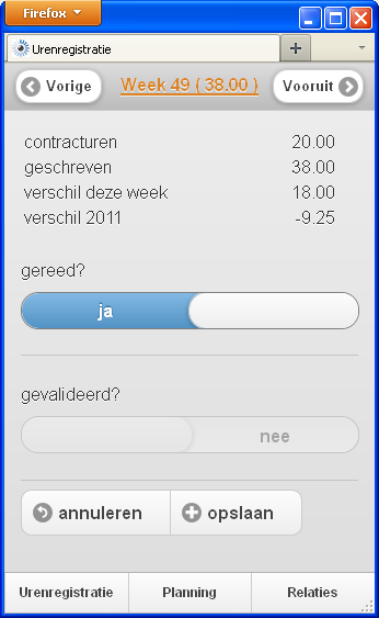 Week detailschermIn het week detailscherm wordt een overzicht van de contracturen en geschreven uren gegeven. In dit scherm kan ook de status van de week op “gereed” gezet worden ten teken dat deze klaar is om gevalideerd te worden. Onder de “gereed” knop wordt de validatiestatus van de week in kwestie getoond.